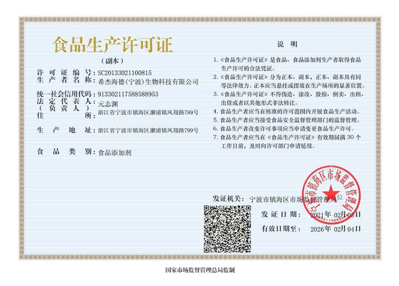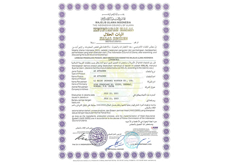 海德公司建立了嚴(yán)格的生產(chǎn),質(zhì)量和食品安全管理體系。擁有食品添加劑生產(chǎn)許可證,質(zhì)量管理認(rèn)證,食品安全認(rèn)證,包括:ISO9001:2008認(rèn)證、ISO22000:2015認(rèn)證、BRC認(rèn)證認(rèn)證,和Star-K頒發(fā)的KOSHER認(rèn)證、IFANCA 和MUI 頒發(fā)的HALAL認(rèn)證公司。
